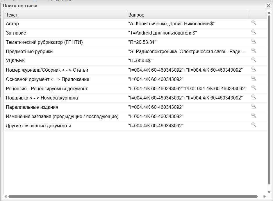 НАЧАЛО >> Сервер приложений ИРБИС 64/128 >> Описание модулей системы >> Cataloguer - АРМ Каталогизатор >> Руководство пользователя >> Интерфейс АРМ Каталогизатор >> Область списка записей >> Область управления списком записей >> Поиск по связи
