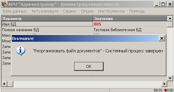 Процесс реорганизации файла документов завершается выводом соответствующего сообщения: