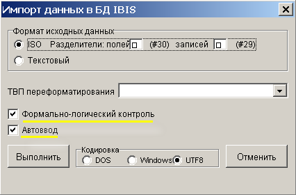 Параметры ФОРМАТ ИСХОДНЫХ ДАННЫХ и ТВП ПЕРЕФОРМАТИРОВАНИЯ должны соответствовать аналогичным параметрам импортируемых документов.