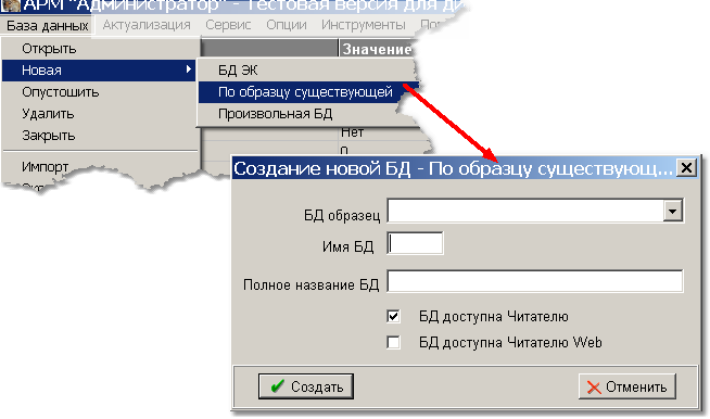 Рисунок 3 - Режим: БАЗА ДАННЫХ / НОВАЯ / ПО ОБРАЗЦУ СУЩЕСТВУЮЩЕЙ
