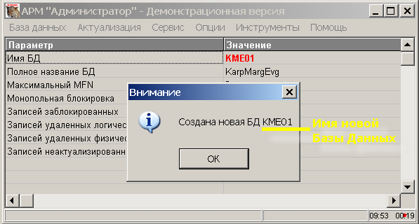 Режим: БАЗА ДАННЫХ-НОВАЯ-ПО ОБРАЗЦУ СУЩЕСТВУЮЩЕЙ позволяет создавать пустую новую БД, совпадающую по структуре (параметрическим файлам) с любой из существующих.
