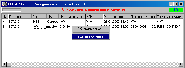 НАЧАЛО >> Оглавление >> TCP/IP сервер протокола ИРБИС 64 >> TCP/IP сервер ИРБИС 64+ >> Пользовательский интерфейс сервера ИРБИС64 >> Список зарегистрированных клиентов
