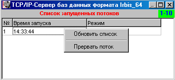 НАЧАЛО >> Оглавление >> TCP/IP сервер протокола ИРБИС 64 >> TCP/IP сервер ИРБИС 64+ >> Пользовательский интерфейс сервера ИРБИС64 >> Список запущенных потоков сетевого чтения-записи